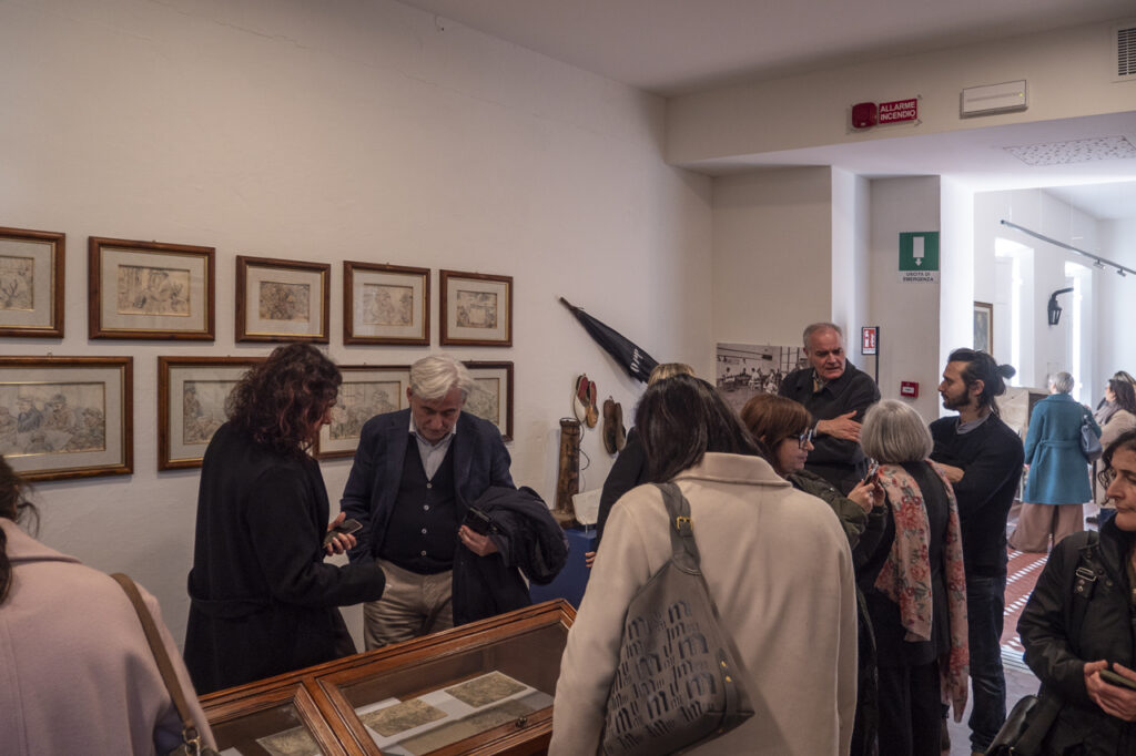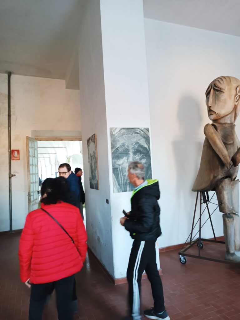 Un ruolo centrale nella restituzione visiva della vita manicomiale è svolto dai disegni di Fidia Palla, gentilmente concessi da Giulia e Ilaria Talini eredi di Fidia, artista ricoverato per oltre vent’anni, che con tratti di penna e matita ha raccontato la quotidianità delle camerate, i volti, l’attesa, il manicomio e il tedio del tempo sospeso. Da questa impostazione, inizialmente legata al lavoro imposto, si sviluppa, soprattutto dopo gli anni Cinquanta, un’altra visione che valorizza il lavoro e l’attività creativa dei malati come strumenti di coinvolgimento e di espressione: è la stagione della socioterapia e dell’arteterapia, della cura attraverso l’arte e la partecipazione attiva. Ne sono testimonianza le opere in ceramica e pittura realizzate dai degenti.