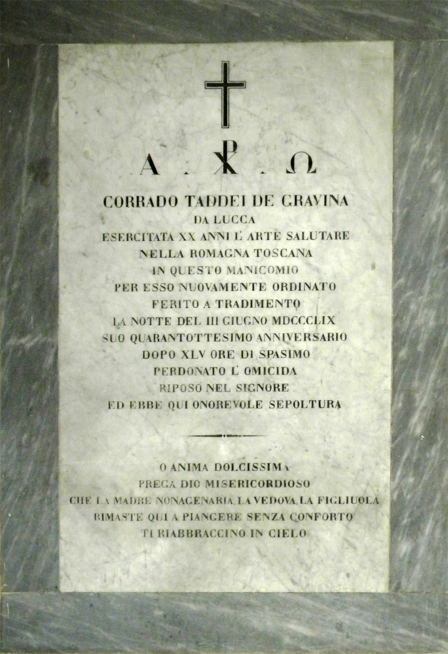 Viene ferito mortalmente da un inserviente il direttore C. Taddei De Gravina nel giorno del suo 48° compleanno, su istigazione sembra del capo cuciniere accusato dei ripetuti furti di carne destinala ai malati.
